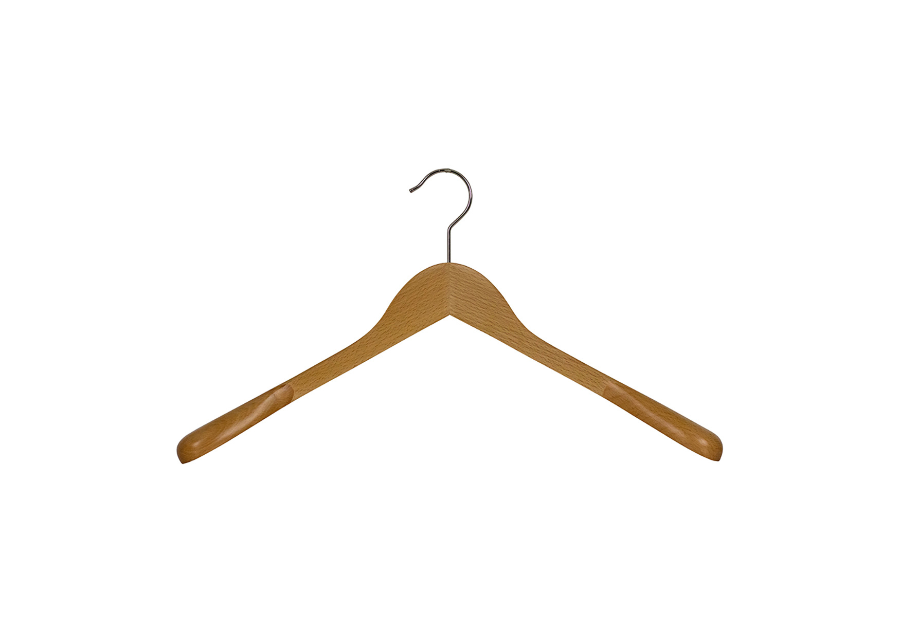Komfort-Formbügel aus Massivholz, körpergeformt, verbreiterte Schulterenden mit angesetztem Teilstück aus Massivholz, drehbarer Haken.