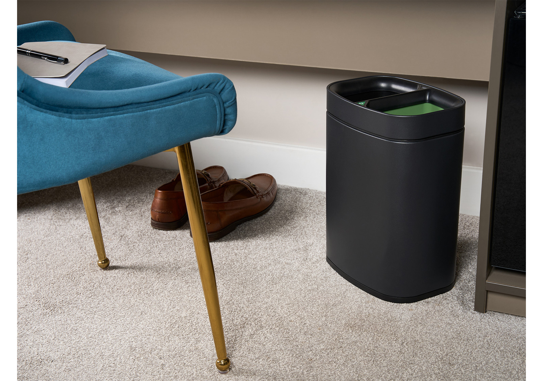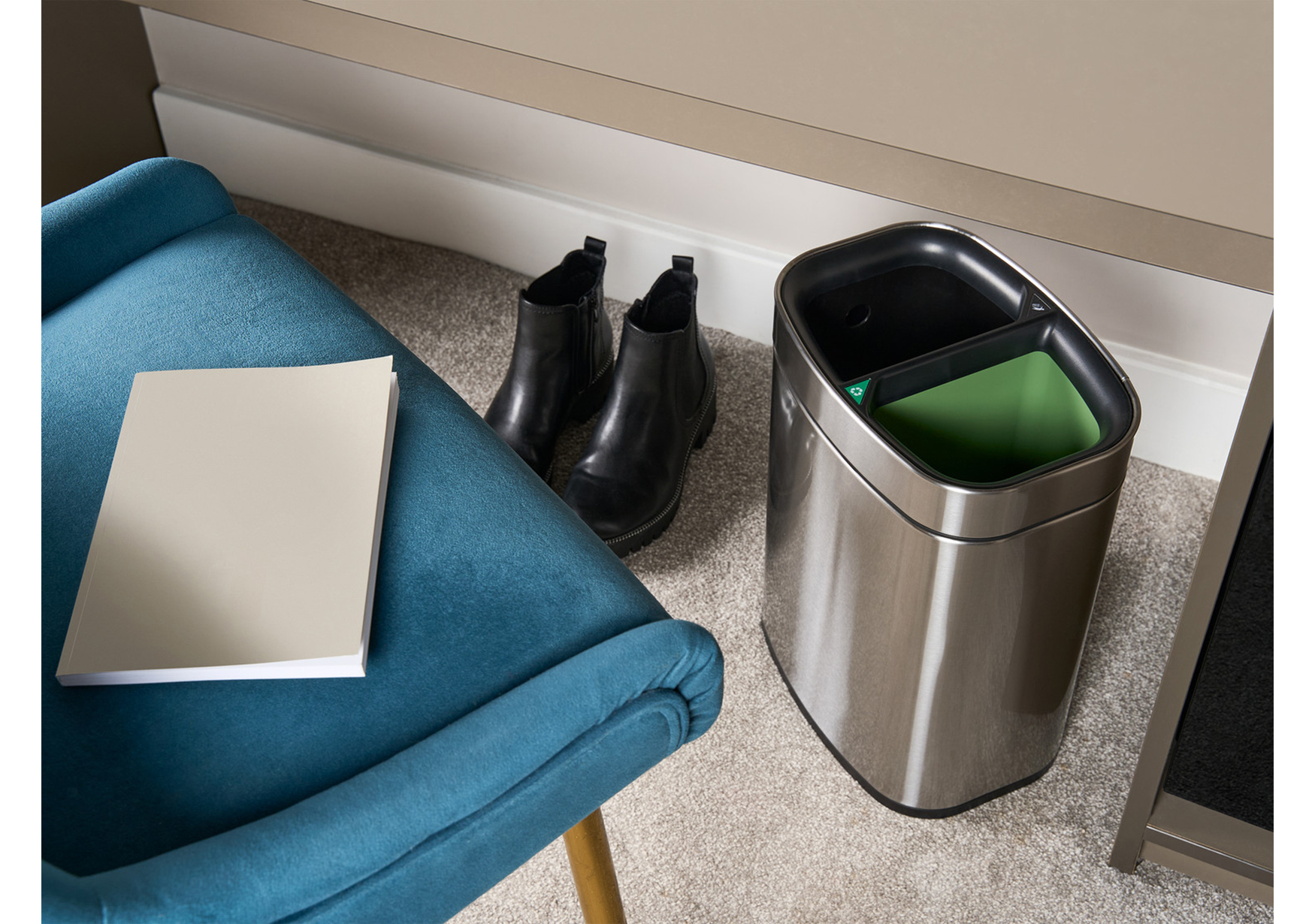 Der Newport Dual Recycling Bin ist die perfekte, umweltfreundliche Lösung für gehobene Hotelzimmer. Dank klarer internationaler Recycling-Icons wird die Mülltrennung für Gäste intuitiv und einfach.