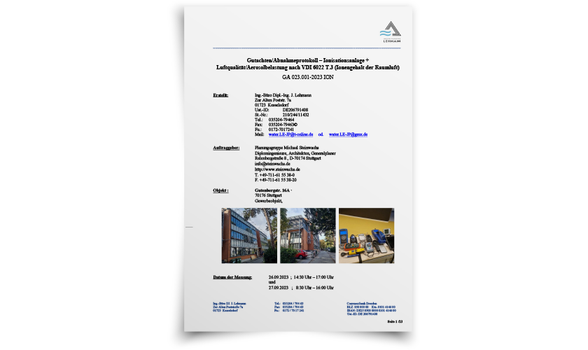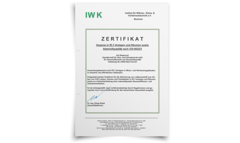 In zahlreichen Gutachten und Messungen – unter anderem durch HygCen Germany GmbH, Ing.-Büro DI Lehmann, Dr.-Ing. Christian Lerche und das Institut für Wärme-, Klima- & Verfahrenstechnik (IWK) – wurde die Technologie auf Raumluftqualität, Keim- und Aerosolreduktion sowie Einhaltung aller relevanten VDI- und EU-Richtlinien geprüft.